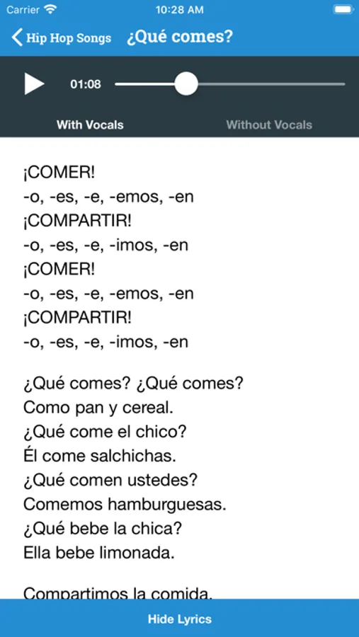 • Engaging Spanish hip hop songs that set key words and phrases to music.