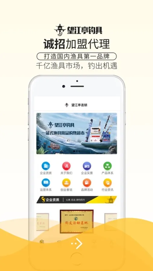 企业全方位展示:各版块清晰介绍企业的荣誉资质、产品体系、运营体系以及店面展示、加盟商活动风采等。通过企业实景,给各位创业者真实展现总部的规模、环境,您不用实地考察也能直观了解项目。通过运营模式的精锐解读,让不懂垂钓的创业者也能快速入行、开店致富。