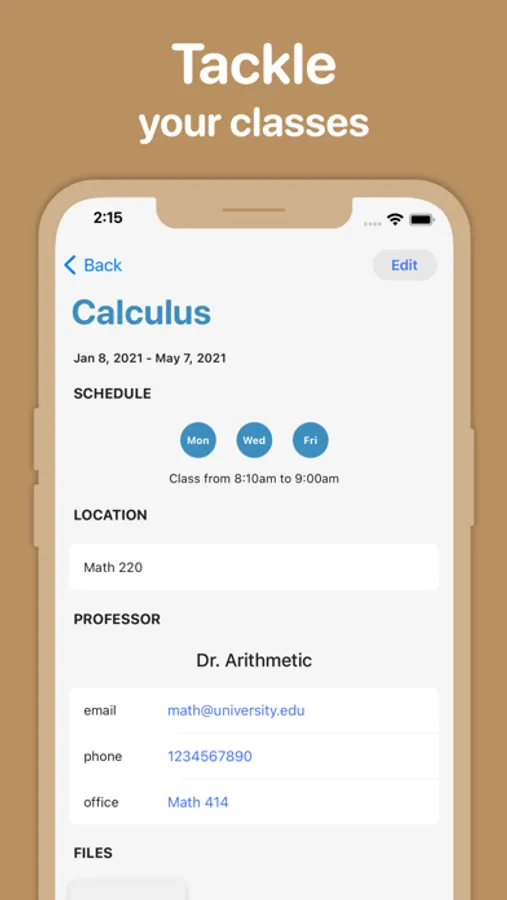 Stop scrambling to find your class syllabus, and keep everything in one place. Professor contact information, class location, syllabus, and schedule can all be kept in the app.