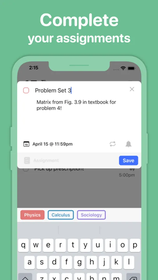 Never miss another deadline. Create assignments or to-do's to keep track of your work. Set due dates for big projects and get notified when they're coming up!