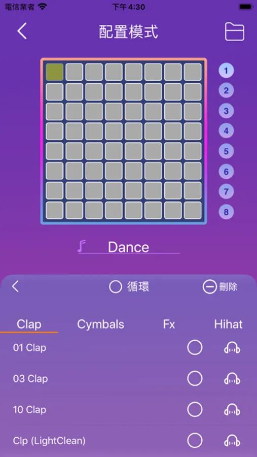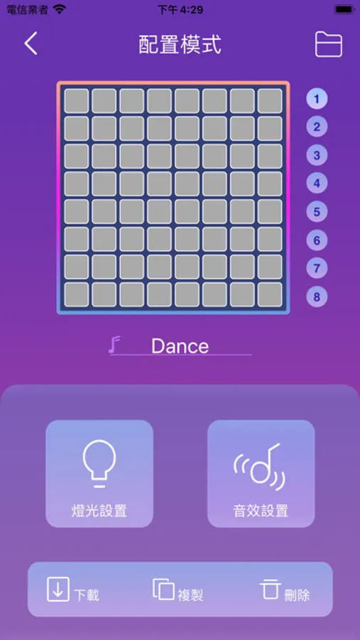 1.預覽電子打擊墊的燈效,試聽內置音效,保存燈效和音效的配置