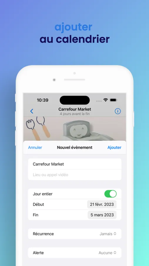 Vous pouvez ajouter les brochures à votre calendrier iPhone/iPad. Vous recevrez un message sur la date de début.