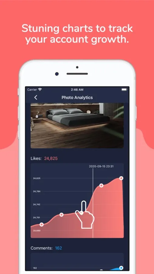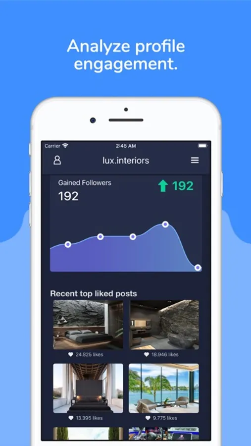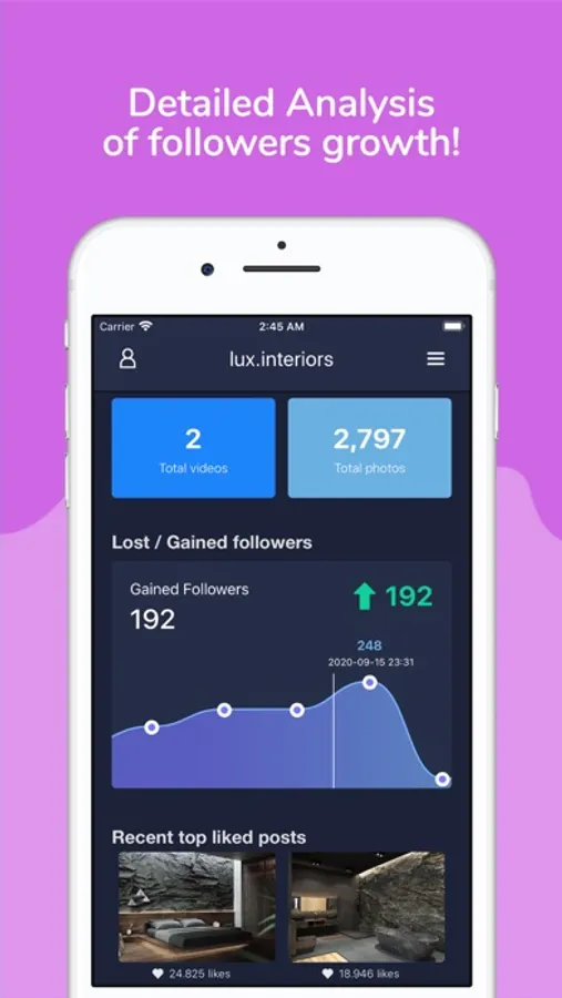 Track how the number of followers, unfollowers and likes are increased. App shows your popular posts and best performing photos.