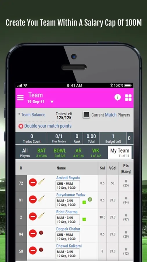 Step 3: Create your team within a budget of 100 credits (IMPORTANT: You have to do this before the real match starts). You can edit/update your team till 30mins or 0 mins before the match start