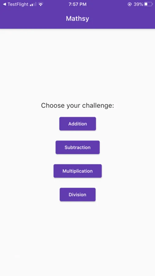 In Mathsy, you can complete math challenges to suit any skill level. The options provided are addition, subtraction, multiplication and division.