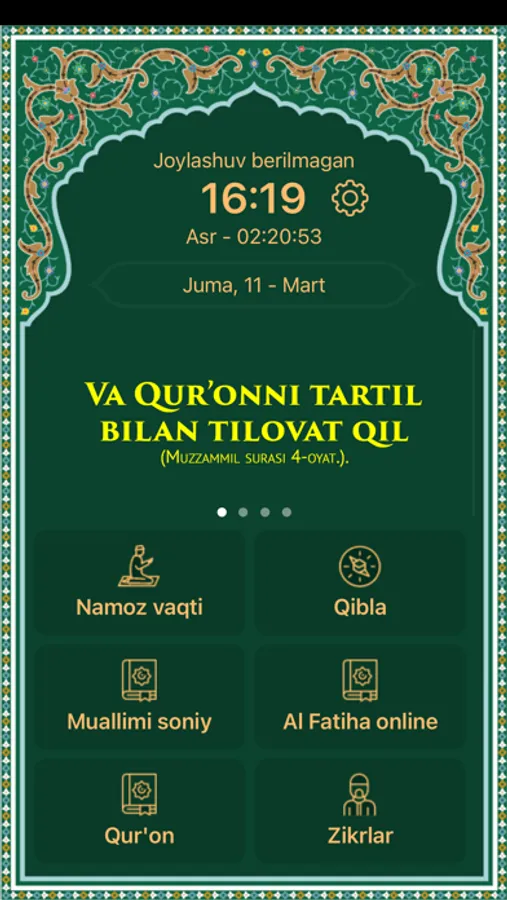 1. Besh mahal namoz vaqtlarini ko'rsatib turish.