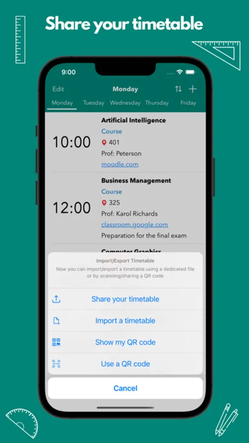 - Import/Export a timetable using a dedicated file or by scanning/sharing a QR code