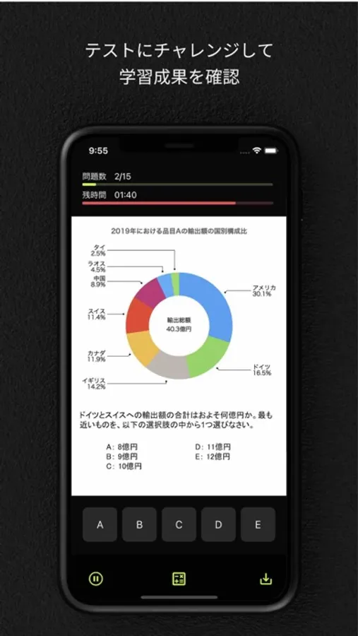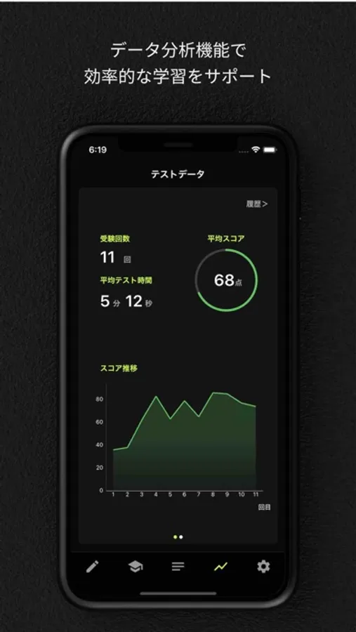 効率的な試験対策をサポートするために、学習・テスト・ノート・データ・設定の5つのモードを備えています。