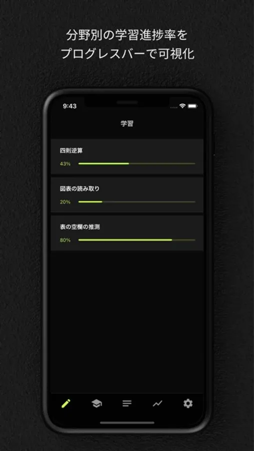 各問題には正解・不正解・未学習といったステータスが表示され、それらのステータスから算出される分野別の達成率をプログレスバーで簡単に確認できます。