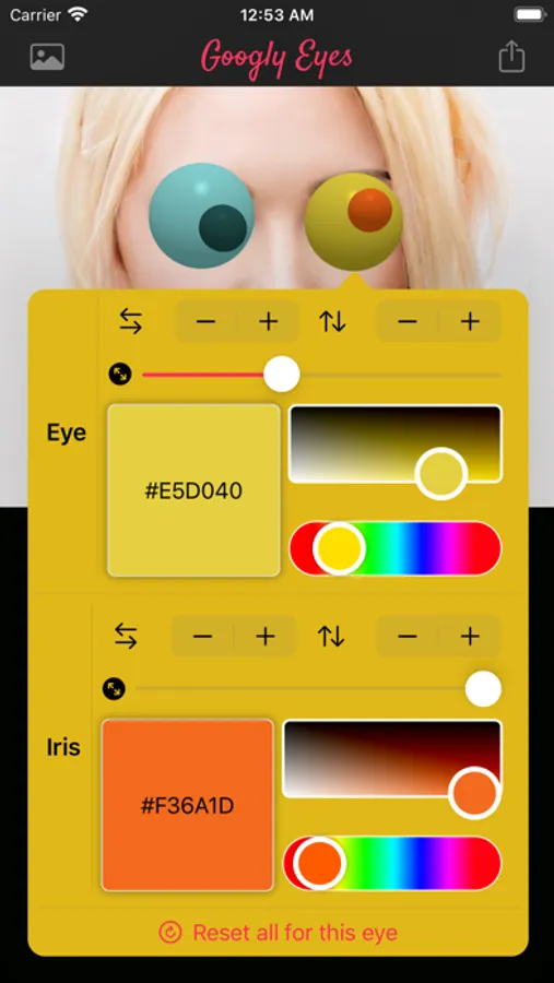 * Cross eyed or wide eyed? To make all future eyes have the same iris position, tap on the googly eye, then tap on "Save iris position"
