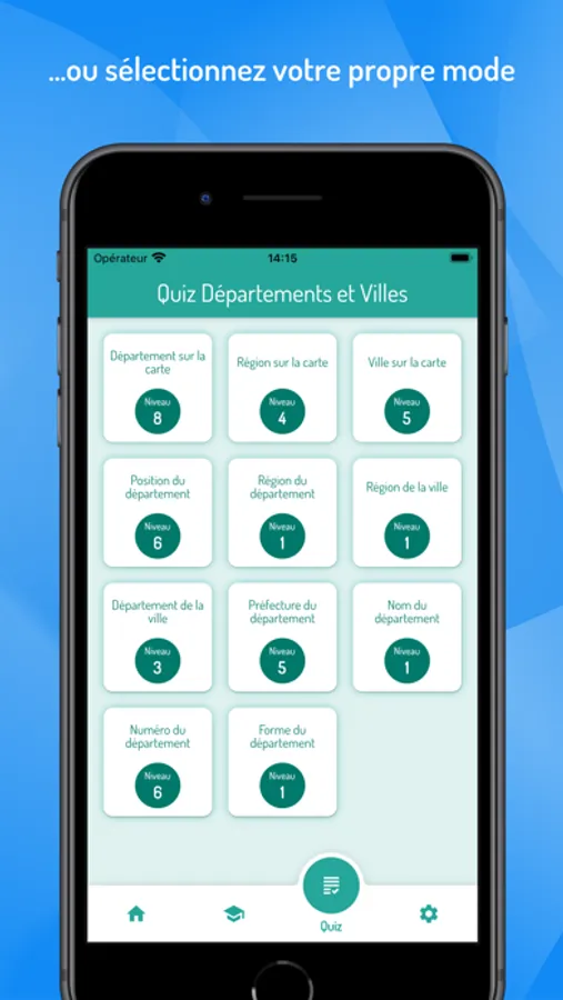 In each quiz mode, you can select between two, four or six choices offered. If your answers are correct, you advance to a higher level with increasingly difficult questions.