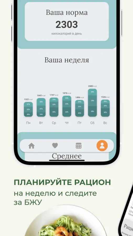 При регистрации приложение попросит поделиться вашими данными: фактическим весом, ростом, датой рождения, полом и уровнем физической активности. После чего – вы получите расчет суточной нормы калорий, БЖУ и доступ к полному функционалу приложения бесплатно на 14 дней.