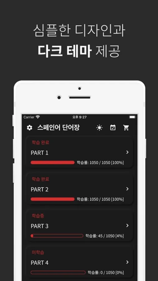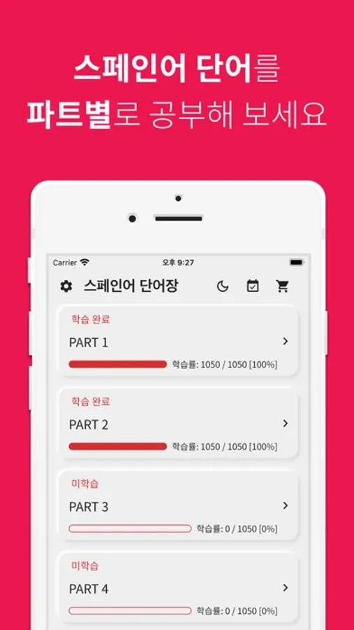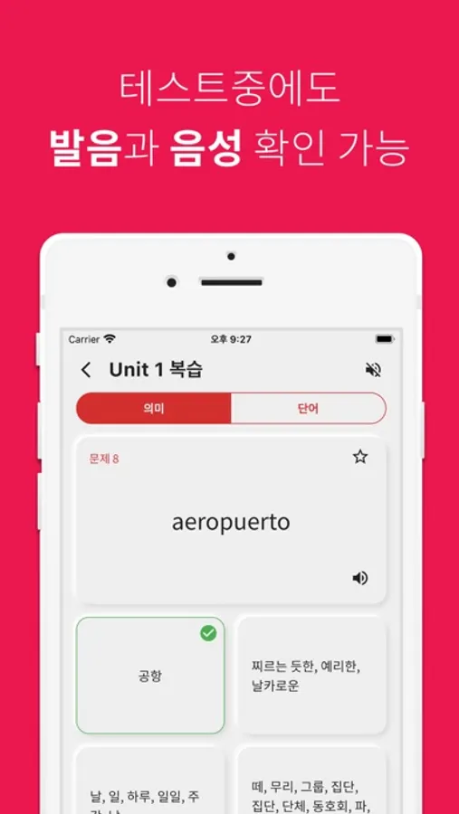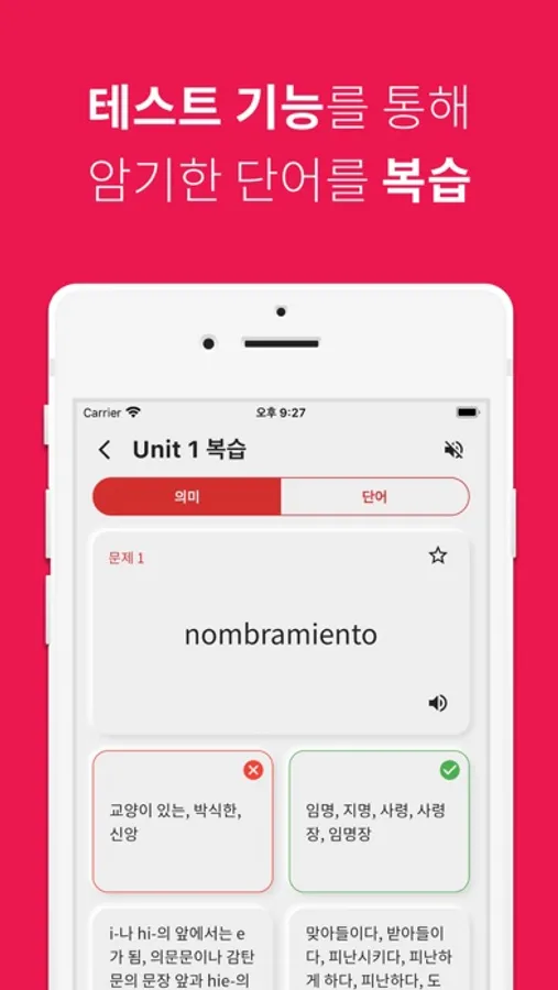 단어 공부는 역시 반복이죠! 공부한 스페인어 단어를 파트별, 유닛별, 전체 단위별로 복습할 수 있습니다.
