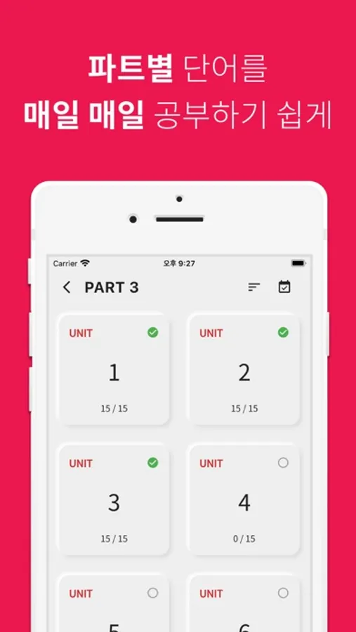 - 학습 진행률 설정/초기화: 파트 또는 유닛을 길게 눌러 학습 진행률을 설정하거나 초기화할 수 있습니다.