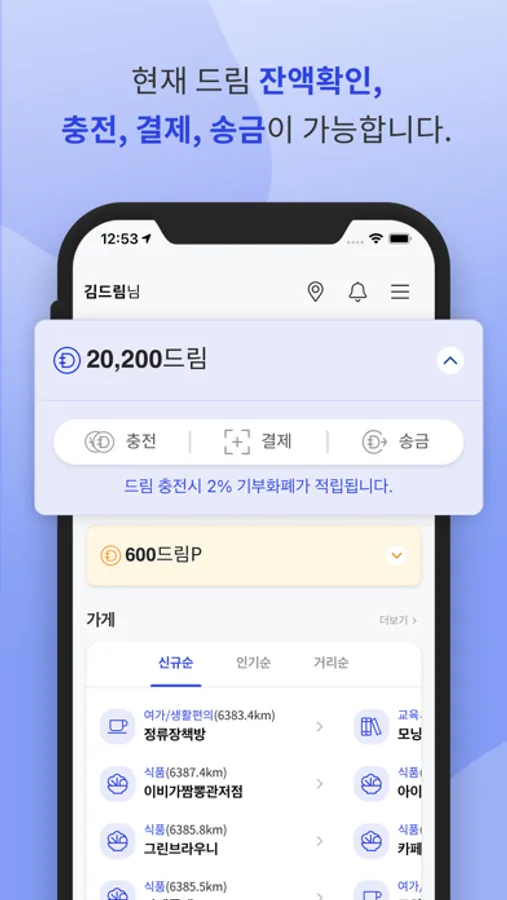 충전시 금액의 2%를 기부포인트로 제공합니다. 기부포인트는 사회문제를 해결하는 드림(기부)프로젝트에 기부할 수 있습니다.