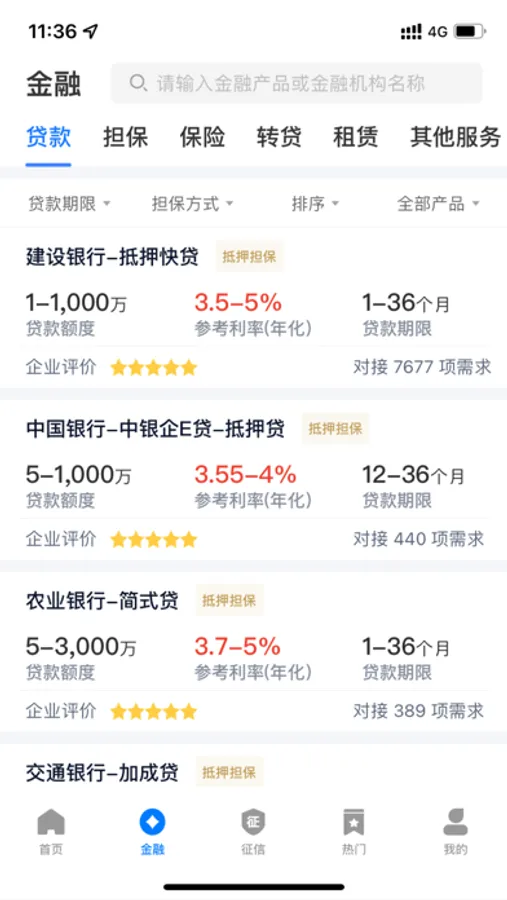 用户可查看江苏省内各金融机构发布的各类金融产品,分为贷款、转贷、保险、租赁、担保、其他服务。