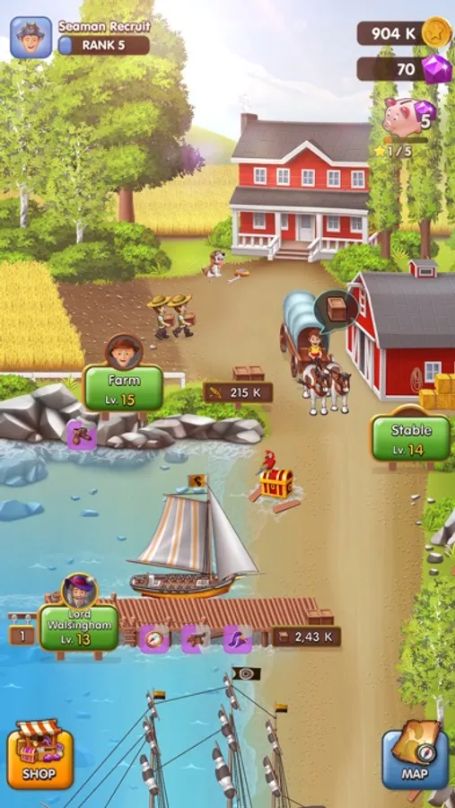 Grow your empire, harvest trading goods, send ships on expeditions and grab treasure chests full of gold or useful items.