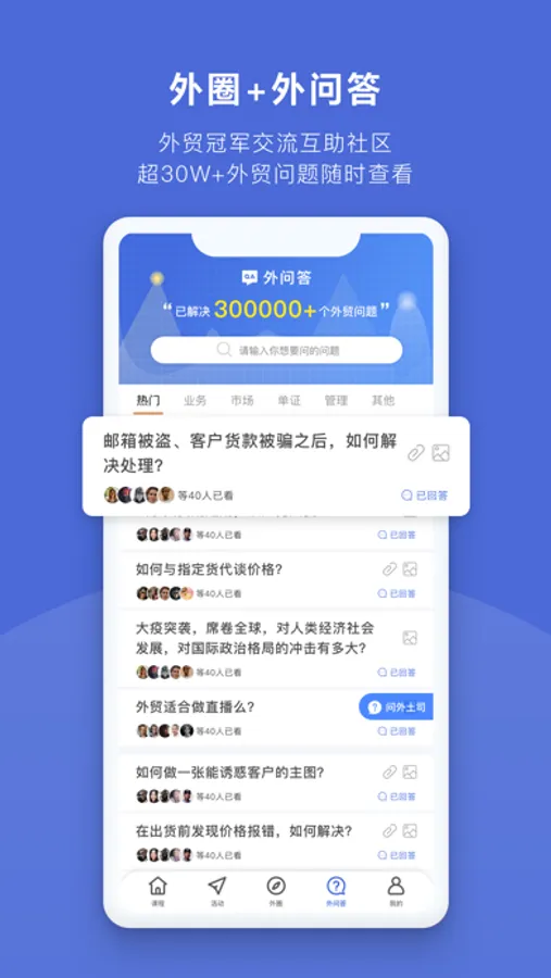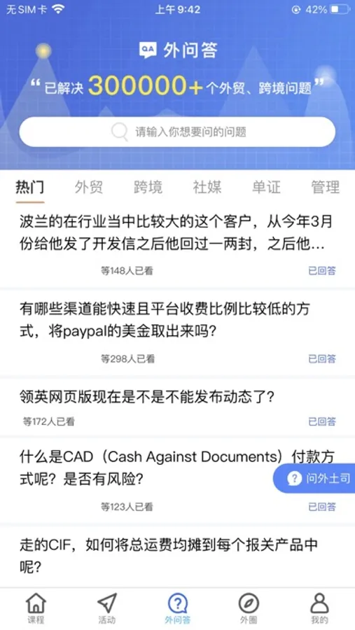 外问答板块提供了外贸全领域约25W个问答信息,学员可不受限制查看和学习,还提供免费下载和优惠。遇到新问题,可以向外土司老师提问,及时获得问题解决方案,为外贸之路保驾护航。
