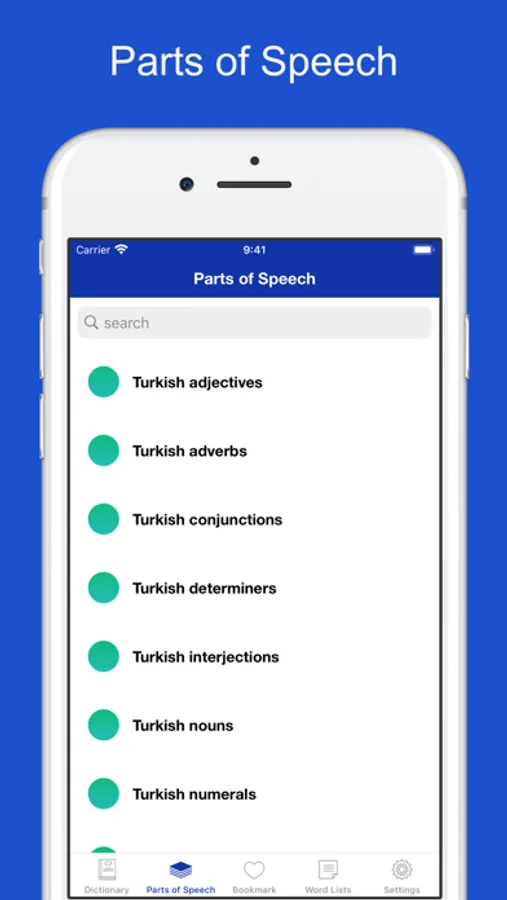 - Turkish adjectives, adverbs, nouns, conjunctions, prepositions, verbs, etc.