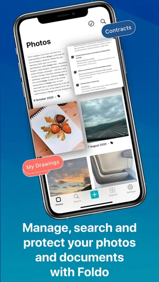 - Search the text inside your photos and files: thanks to the Artificial Intelligence features, Foldo: Photo and File Manager analyzes your photos and files, making all the words inside searchable (works only for Latin languages and Chinese, doesn't work Arabic o Russian Languages)