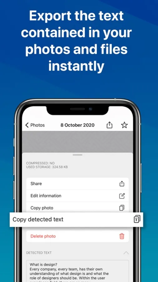 - Export the text contained in all the photos and files: you can easily export the text contained in your photos and files to send it to whomever you want by simply copying it and pasting it on Whatsapp, Mail or any other application (works only for Latin languages, and Chinese - when the language of the app is set in Chinese)