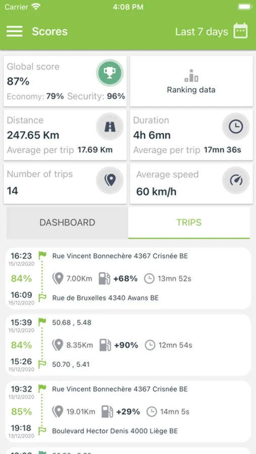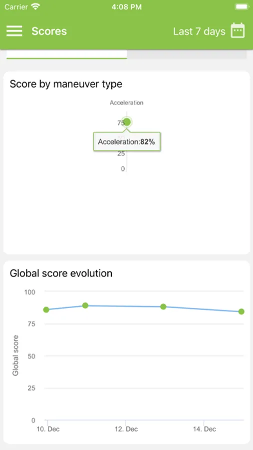 - Vos scores de Sécurité et Eco conduite, disponibles sur une période prédéfinie ou pour un trajet.