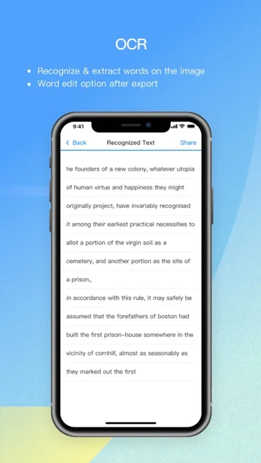 OCR (optical character recognition) feature extracts texts from single page for further editing or sharing.