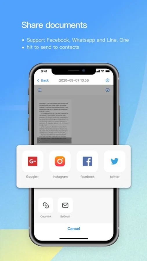 Easily share documents in PDF or JPEG format with others via social media, email attachment or sending the doc link.
