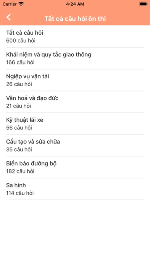Ứng dụng gồm đầy đủ 600 câu hỏi dùng cho sát hạch, cấp giấy phép lái xe cơ giới đường bộ giúp các bạn chuẩn bị thi bằng lái xe cơ giới một cách nhanh chóng và hiệu quả nhất.