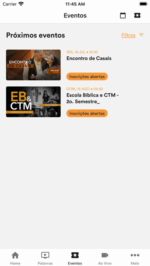 - Siga a agenda e fique por dentro de tudo que acontece na igreja, inscreva-se em eventos e tenha seus ingressos sempre com você.