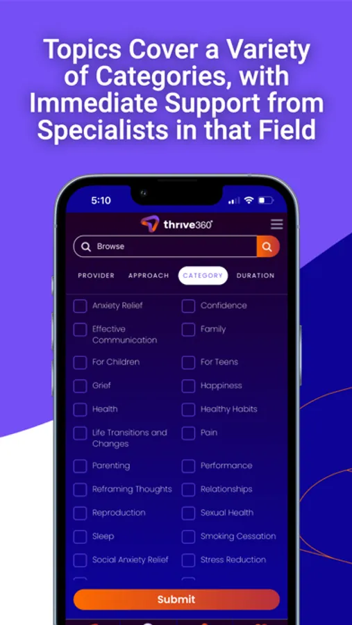 With Thrive360, you have a professional guide in your pocket, available to you anytime, anywhere. No more waiting for appointments or speaking with strangers. You can now receive personalized support and guidance within the comfort and privacy of your own space. Thrive360 recreates and enhances the in-office experience with specialists in different areas, so you can get trusted support immediately.