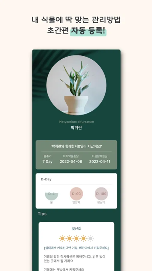 - 등록 식물의 물주기, 선호하는 햇빛 물 온도등을 자동으로 셋팅해줘요