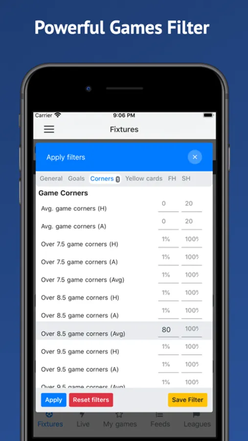 Games Filter - Search games that meets your criteria. E.g.: see only games with more than 70% over 2.5 game goals in last 5 games at home. You can search by any stat you want.