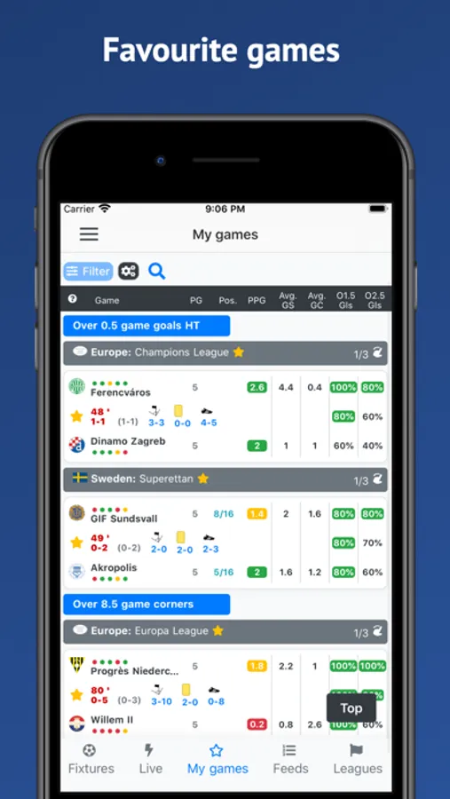 Favourite Games - Choose your games to follow and get instant notifications for every event (goals, corners, cards, substitutions, VAR, etc.). You can group your games by betting lists, so you know what you are looking for in a certain game.