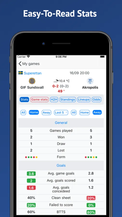 Get easy to read football stats and live scores in same app. Goals, corners, cards, HT, FT, referee stats, you can find all this in the app.