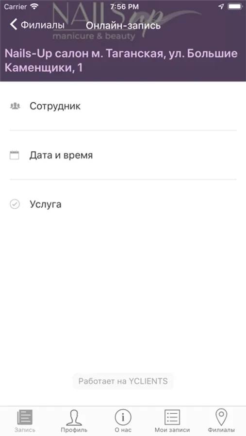 Приложение для самостоятельно on-line записи Гостей сети студий Nails Up, а так же для информирования о проходящих акциях и спец.предложениях.