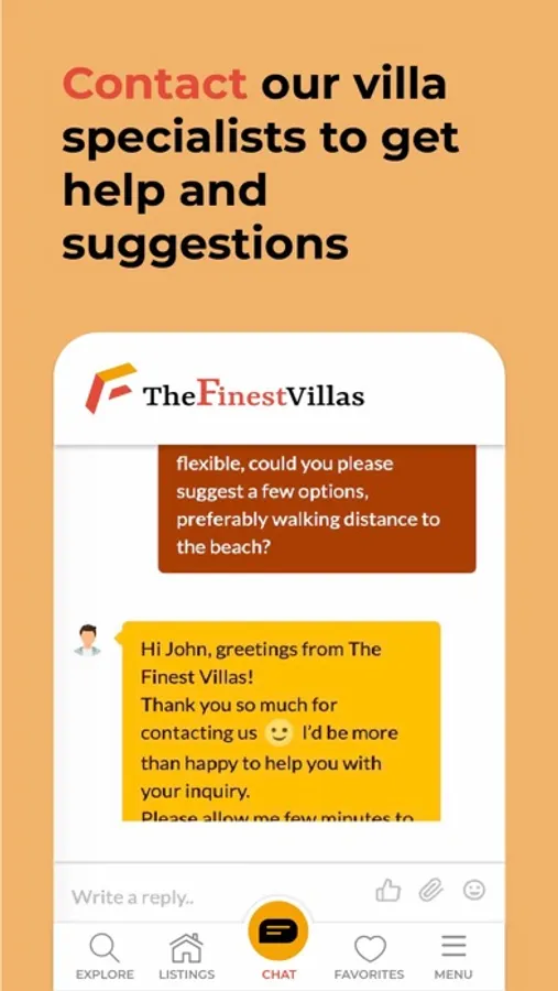 - Contact our Villa Specialists through the app’s chat system or by emailing us. Our specialists will be available to help you find the perfect accommodation and to organise any service you might requests (from daily cars with drivers to personal chefs)