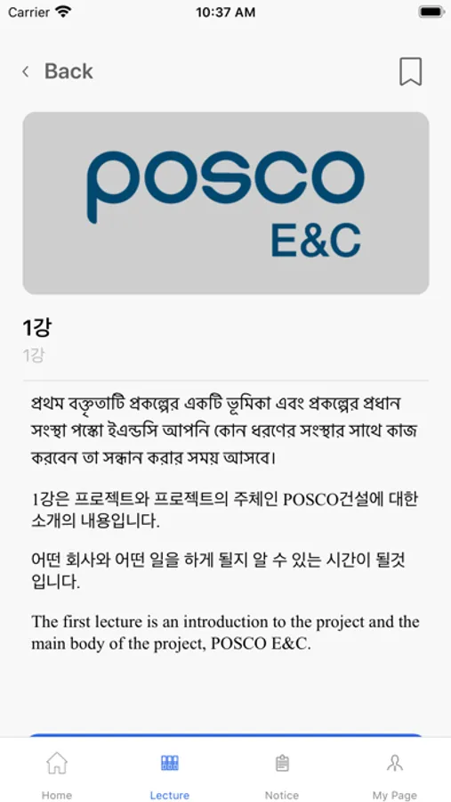 PCCT(POSCO E&C Construction Craft Training) 어플은 기업시민 경영이념 실천을 위해 포스코건설, 포스코1%나눔재단,인하대학교 국제개발협력혁신센터가 함께 만든 건설기능인력양성을 위한 어플입니다. 건설관련 취업을 희망하는 방글라데시 청년들은 어플을 통해 한국문화, 건설기초, 안전, 목공 등 실무 이론과 세부 전공별 실습을 온라인으로 수업받고 퀴즈를 풀며 학습 할 수 있습니다.