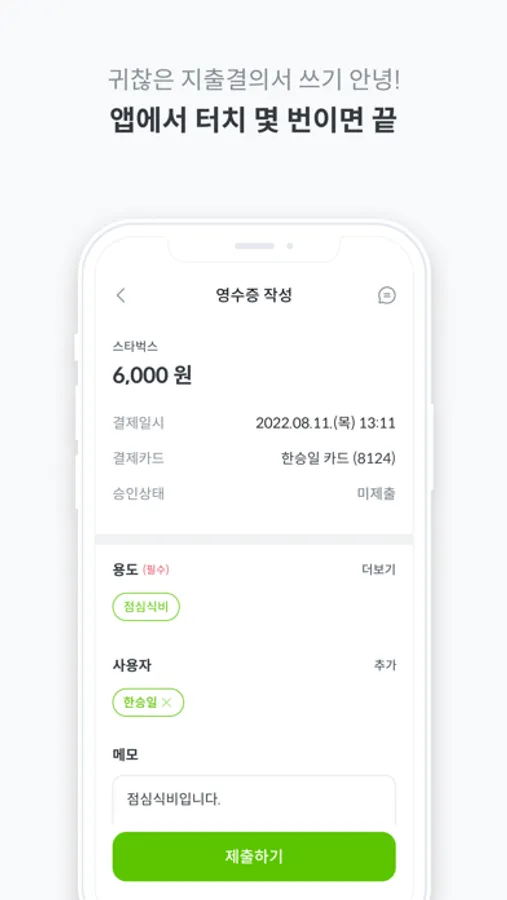 - 지출결의서 쓰기 귀찮죠? 무슨 건으로, 왜 쓴건지 간단하게 터치 몇 번으로 끝!