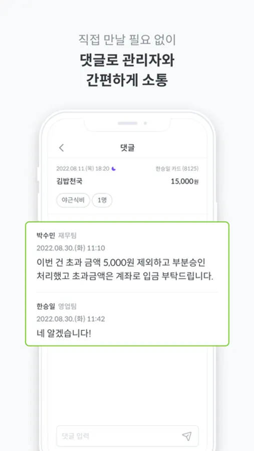 - 별도 카드 사용이라면? 댓글로 재무 담당자와 쉽고 빠르게 소통해 보세요.