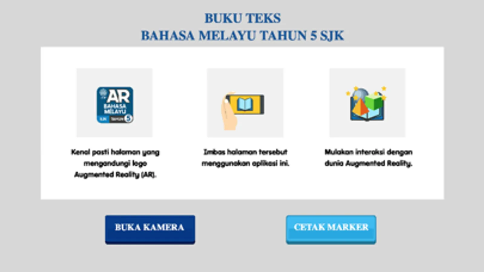 Aplikasi ini merupakan aplikasi Augmented Reality (AR) bagi Buku Teks Bahasa Melayu Tahun 5 SJK terbitan Dewan Bahasa dan Pustaka. Berikut merupakan halaman Marker bagi AR: