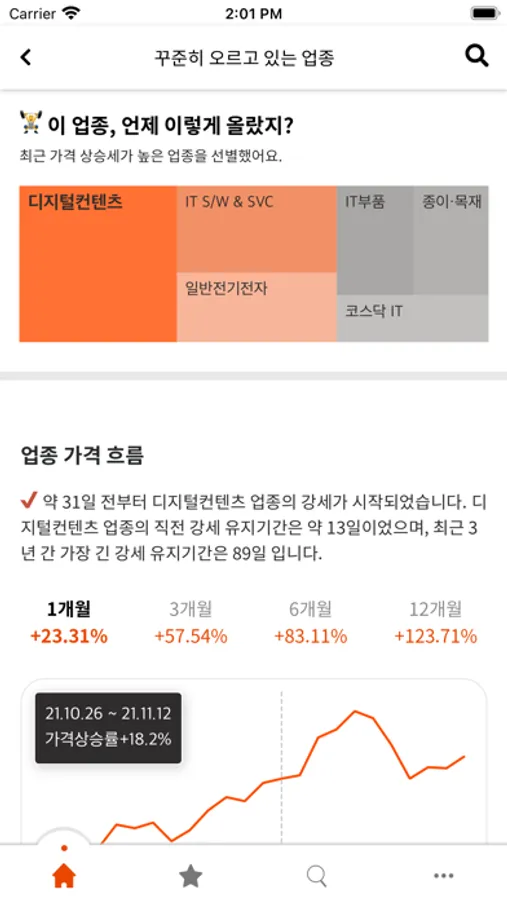 투자콕은 어제 오늘 상승한 종목이 아닌 1년치 가격 데이터로 꾸준한 상승세를 판단합니다.