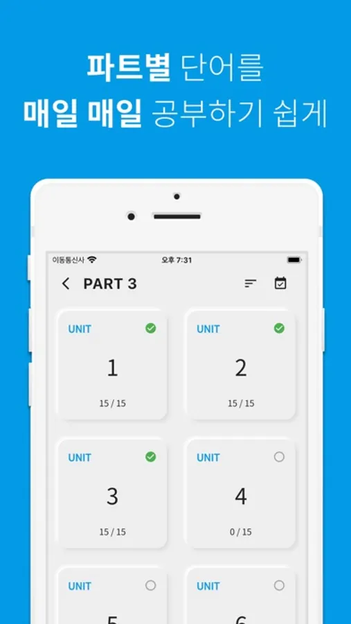 - 학습 진행률 설정/초기화: 파트 또는 유닛을 길게 눌러 학습 진행률을 설정하거나 초기화할 수 있습니다.