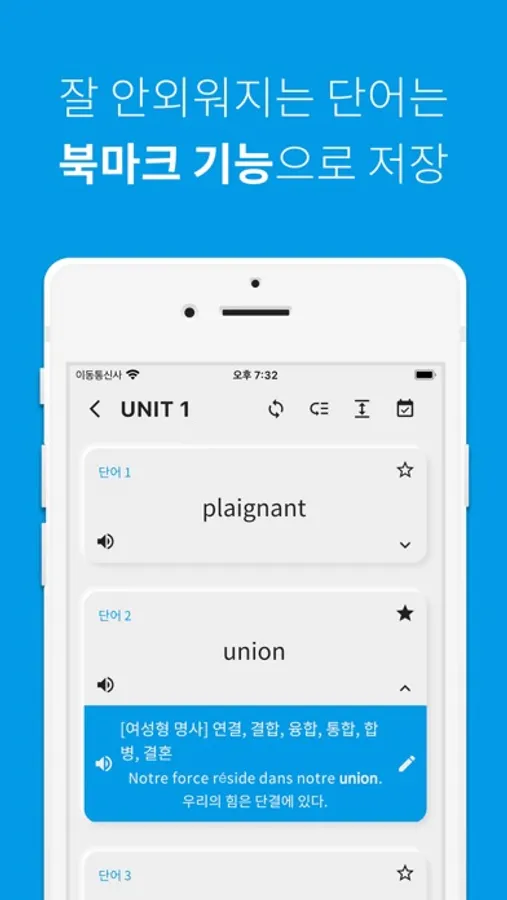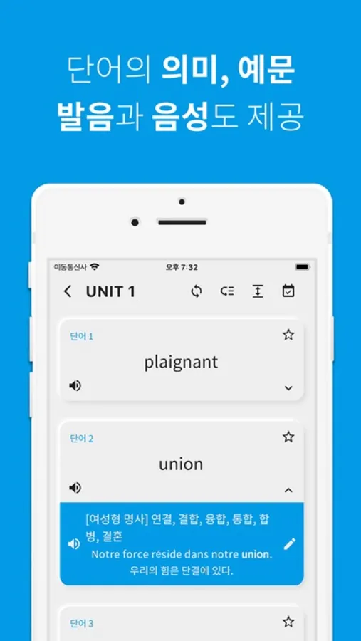 단어 공부는 역시 반복이죠! 공부한 프랑스어 단어를 파트별, 유닛별, 전체 단위별로 복습할 수 있습니다.