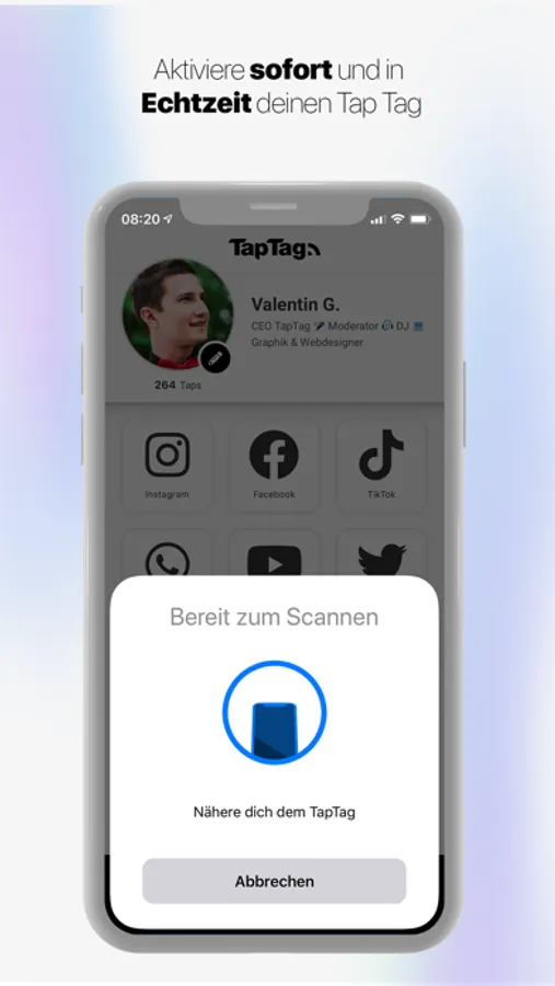 Mit einem einfachen „Tap“ werden deine Daten sofort mit der anderen Person geteilt. Diese benötigt weder App noch einen TapTag, um deine Informationen zu erhalten.