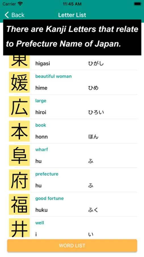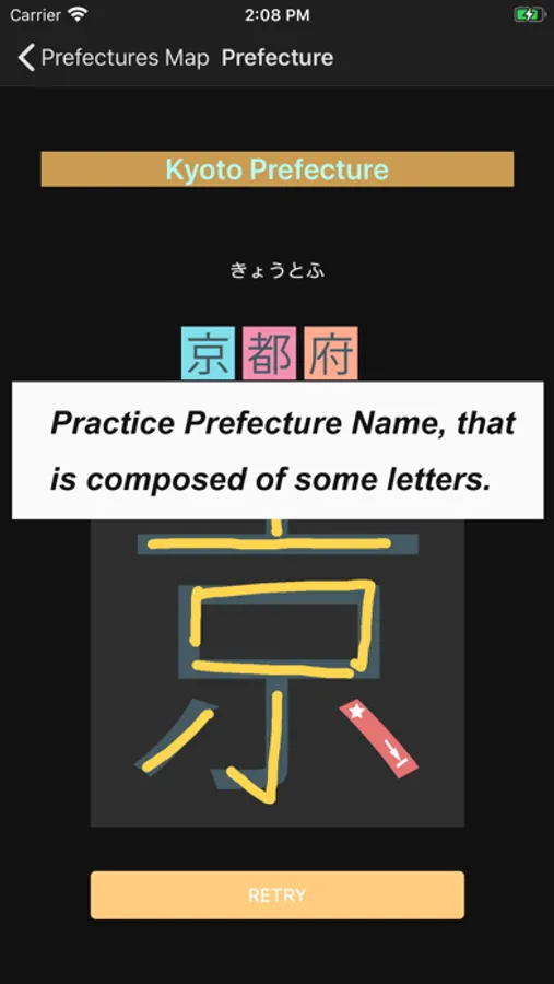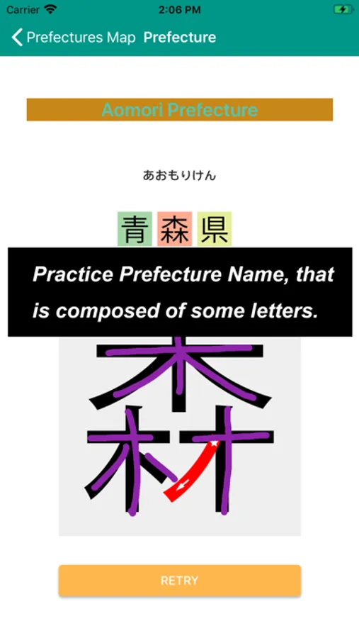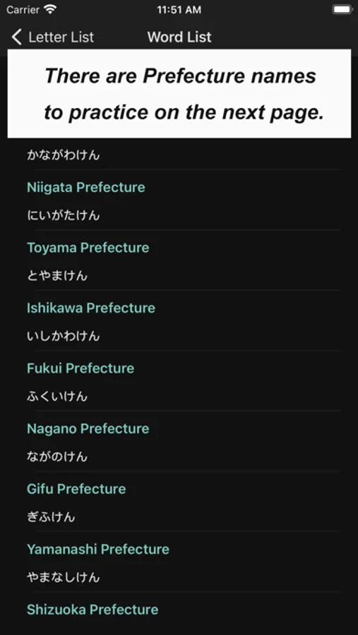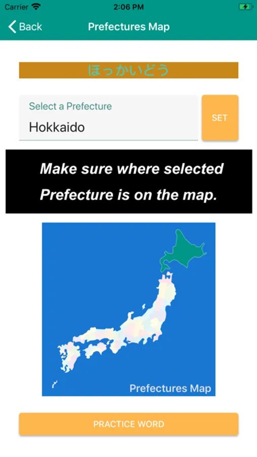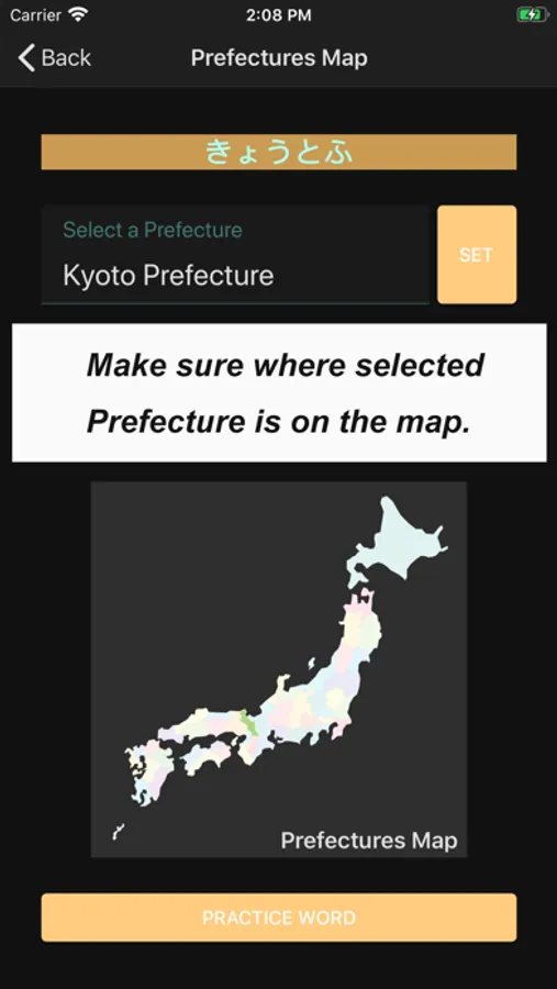 On the one part where you could practice Japanese letters, that used in the name of Prefecture in Japan. On the other part where you could make sure where it is on a simple map by selecting a prefecture you want to see.