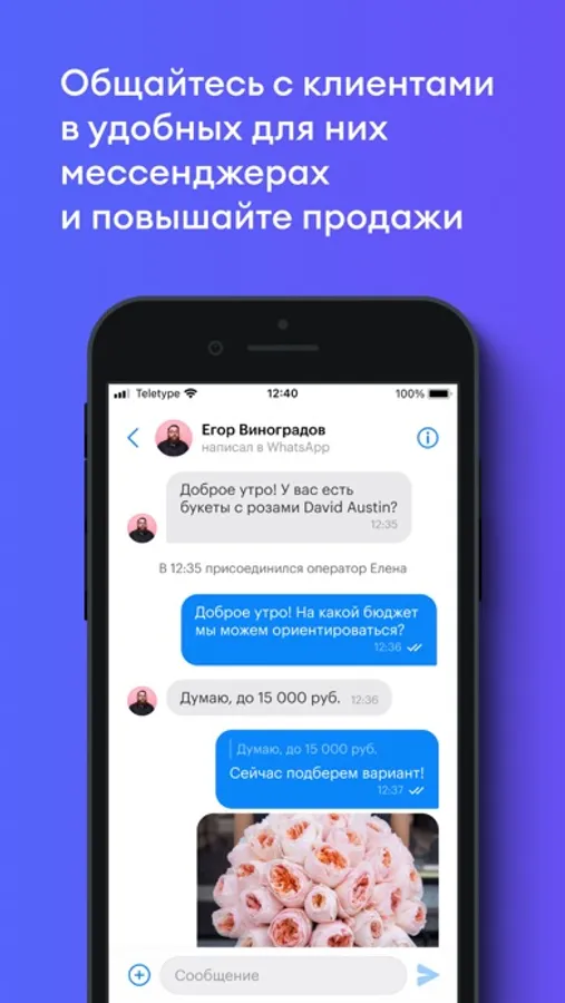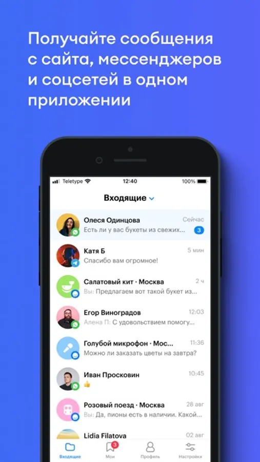 Мобильное приложение Teletype поможет быть на связи с клиентами 24/7. Объедините сообщения со всех популярных мессенджеров, социальных сетей, чата на сайте и отвечайте клиентам быстрее.