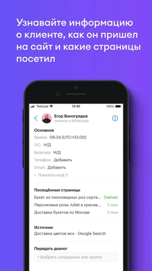 • Видеть информацию о клиенте: имя, город, устройство, как он пришел на ваш сайт и какие страницы посетил