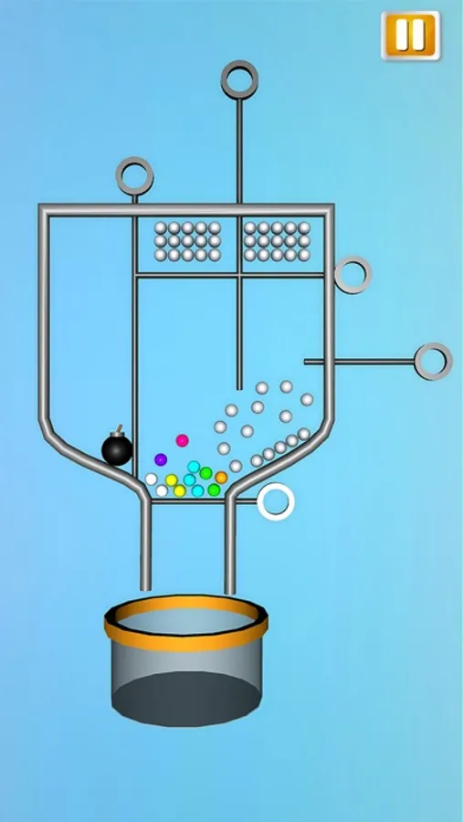 Pull the pin to let all the balls fall into the bottom container. Also,you may notice that some balls are colorless. They need to touch at least one colored ball to get color. So simple yet so interesting! At the same time,three obstacles( bombs, pegboards and black holes)may get in your way,watch it!Get ready to train your brain and relax!