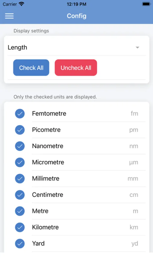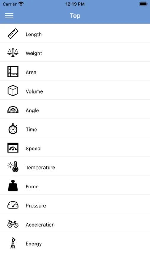 Length, Weight, Area, Volume, Angle, Time, Speed, Temperature, Force, Pressure, Acceleration, Energy